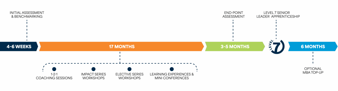17 months of practical mastery. 8 Impact workshops. 30+ electives. Executive coaching. All through apprenticeship levy funding. The only programme where organisational gains fund personal growth.